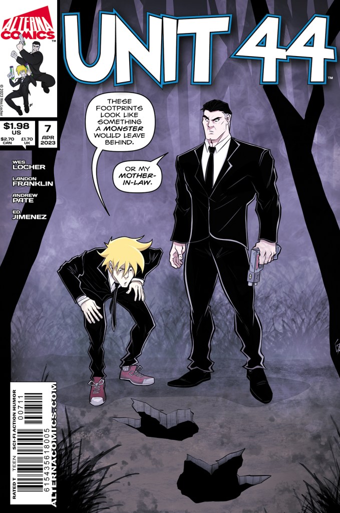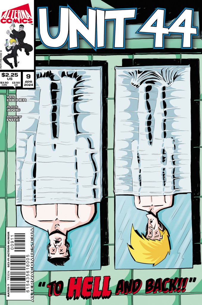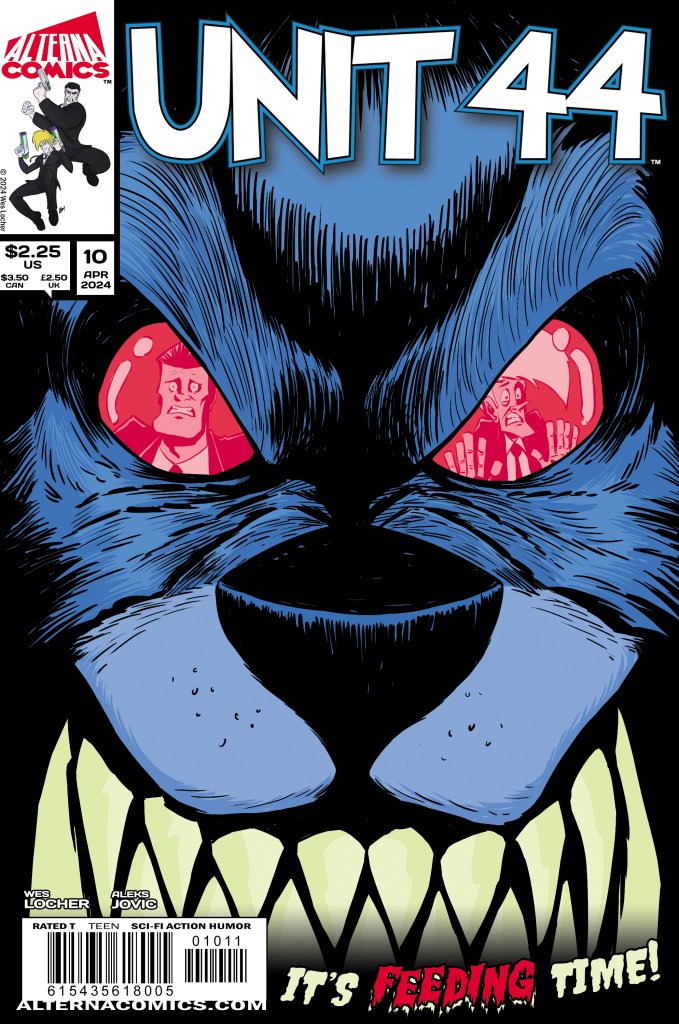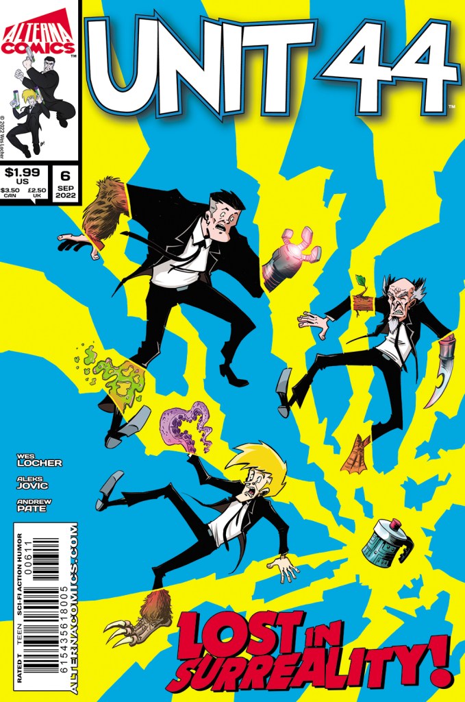 Unit 44 was created by writer/letterer Wes Locher and is published by Alterna Comics. The first four issues were released in 2017 as a graphic novel, and rereleased in 2019 as part of Alterna’s newsprint initiative featuring art and colors by Ed Jiménez. The series returned in 2022 for more zany action with artists Aleksandar Jovic, Landon Franklin and colorist Andrew Pate.