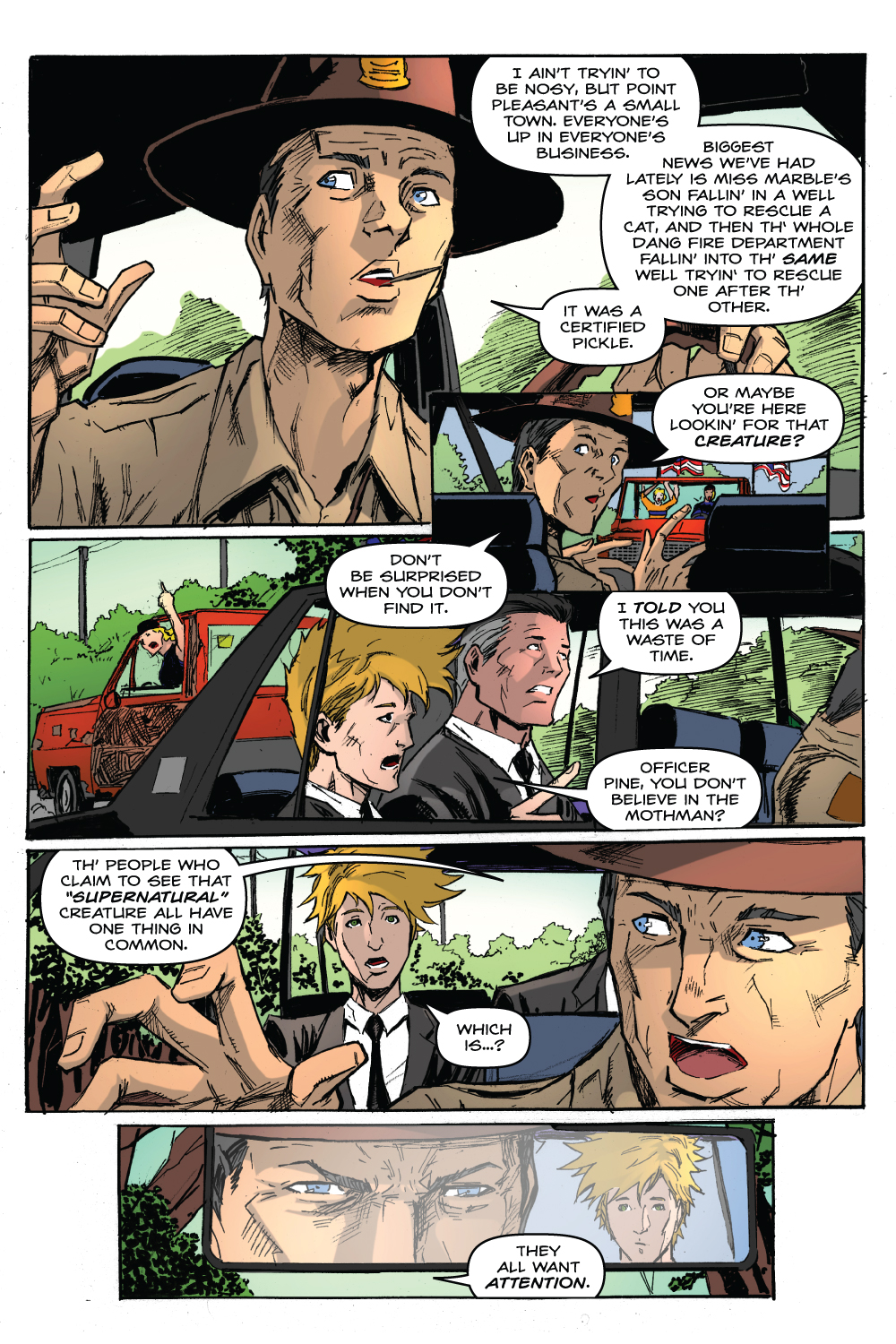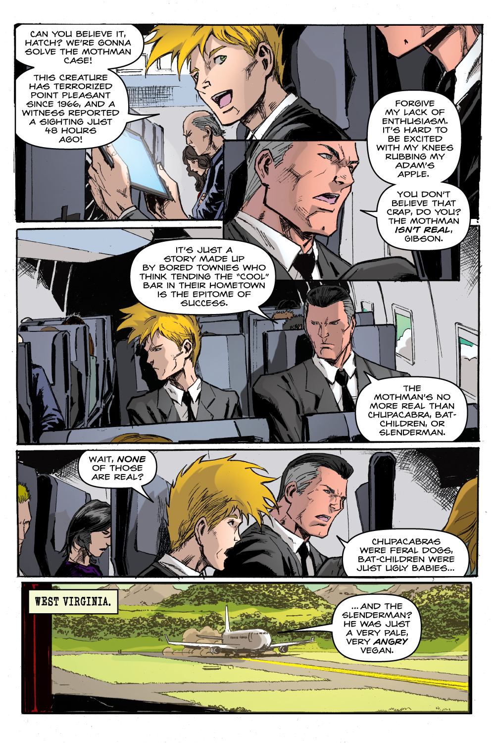 Incompetent Area 51 agents Gibson and Hatch arrive in Point Pleasant, West Virginia to investigate a sighting of the famed Mothman. But while Agent Hatch is quick to brush off the case as a hoax, a close encounter with the cryptid changes his tune, forcing the pair to solve the mystery once and for all. Featuring special guest artist Landon Franklin!